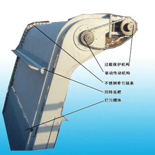 在電動機的驅動下,通過減速機減速后,帶動鏈輪及鏈條運動,固定在回轉鏈條上除污齒耙鏈條在柵后運動到底部,經過導輪后翻轉到柵前迎水面的位置繼續(xù)運動插入固定柵條的間隙中上行,把柵前攔截的污物帶出水面,并隨著鏈條的運動到出渣口處自動翻轉,污物自卸到格柵后的輸送機或渣桶中,完成排污過程,液體則通過柵條的柵隙流過,整個工作狀態(tài)連續(xù)循環(huán)進行。