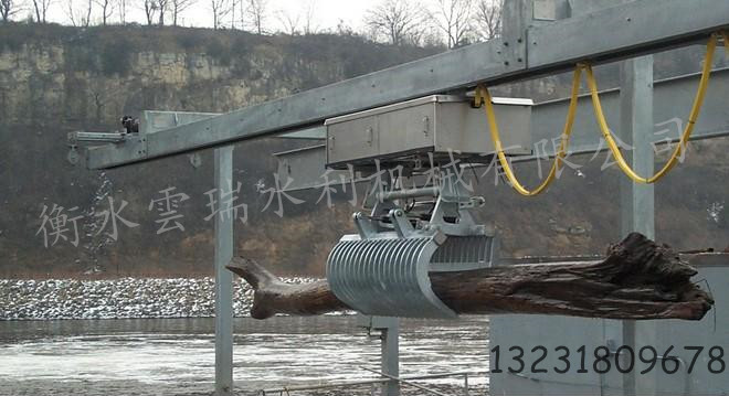 抓斗式清污機(jī)主要包括四個(gè)部分:抓斗裝置、滑車(chē)、行車(chē)導(dǎo)軌及PLC全自動(dòng)控制系統(tǒng)。