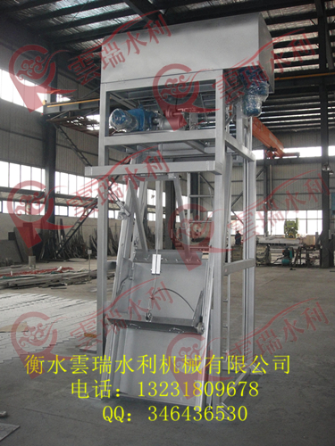 本機(jī)由機(jī)架、鋼繩驅(qū)動(dòng)及過扭保護(hù)裝置,二根牽引鋼繩和置于中間的一根開閉耙鋼繩,導(dǎo)向輪、松繩開關(guān)、耙斗開閉裝置、耙斗及斗車,格柵、導(dǎo)軌及托渣板、撇渣板、導(dǎo)渣板、電控設(shè)備等構(gòu)成。工作循環(huán)過程如下:在發(fā)出工作指令后,鋼繩驅(qū)動(dòng)裝置開動(dòng)放繩,耙斗從最高位置(上一循環(huán)撇渣結(jié)束處)沿導(dǎo)軌下行,撇渣板在自重的作用下隨耙斗下降。當(dāng)撇渣板復(fù)位后,耙斗在開閉耙裝置(電動(dòng)推桿)的推動(dòng)下通過中間鋼繩的牽引張開并繼續(xù)下行直至抵達(dá)渠(井)底下限位,因限位桿阻擋,小車停動(dòng)而鋼繩松弛,松繩開關(guān)動(dòng)作,啟動(dòng)電動(dòng)推桿后縮,放松中間鋼繩,使耙斗在自重的作用下閉合。待耙齒插入格柵間隙后,鋼繩驅(qū)動(dòng)裝置開動(dòng)收繩,進(jìn)一步強(qiáng)制耙斗完全閉合后耙斗和斗車沿導(dǎo)軌上行,清除并輸送被格柵攔截曲柵渣,直至觸及撇渣板,在兩者相對運(yùn)動(dòng)的作用下,柵渣被撇出經(jīng)導(dǎo)渣板落入盛渣桶(或輸送機(jī)),完成了一個(gè)工作循環(huán)。在工作過程中,如遇意外障礙導(dǎo)致鋼繩驅(qū)動(dòng)裝置過扭。當(dāng)其扭矩達(dá)設(shè)定值時(shí),即自行報(bào)警停機(jī);如耙斗開閉裝置過載,電動(dòng)推動(dòng)桿推力上升達(dá)設(shè)定值時(shí),推桿過力矩開關(guān)動(dòng)作確保系統(tǒng)安全。